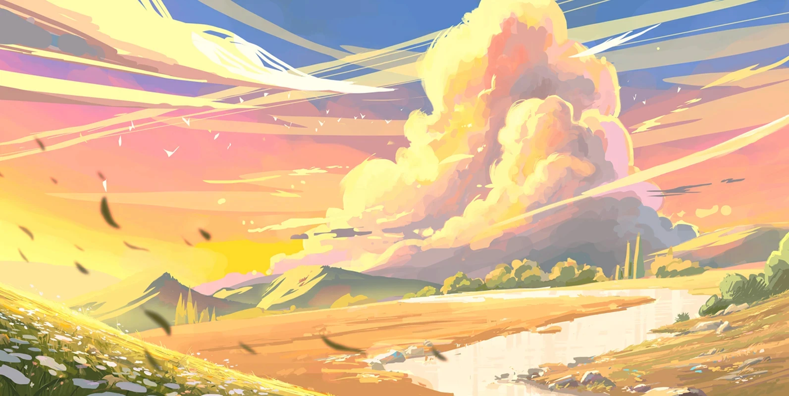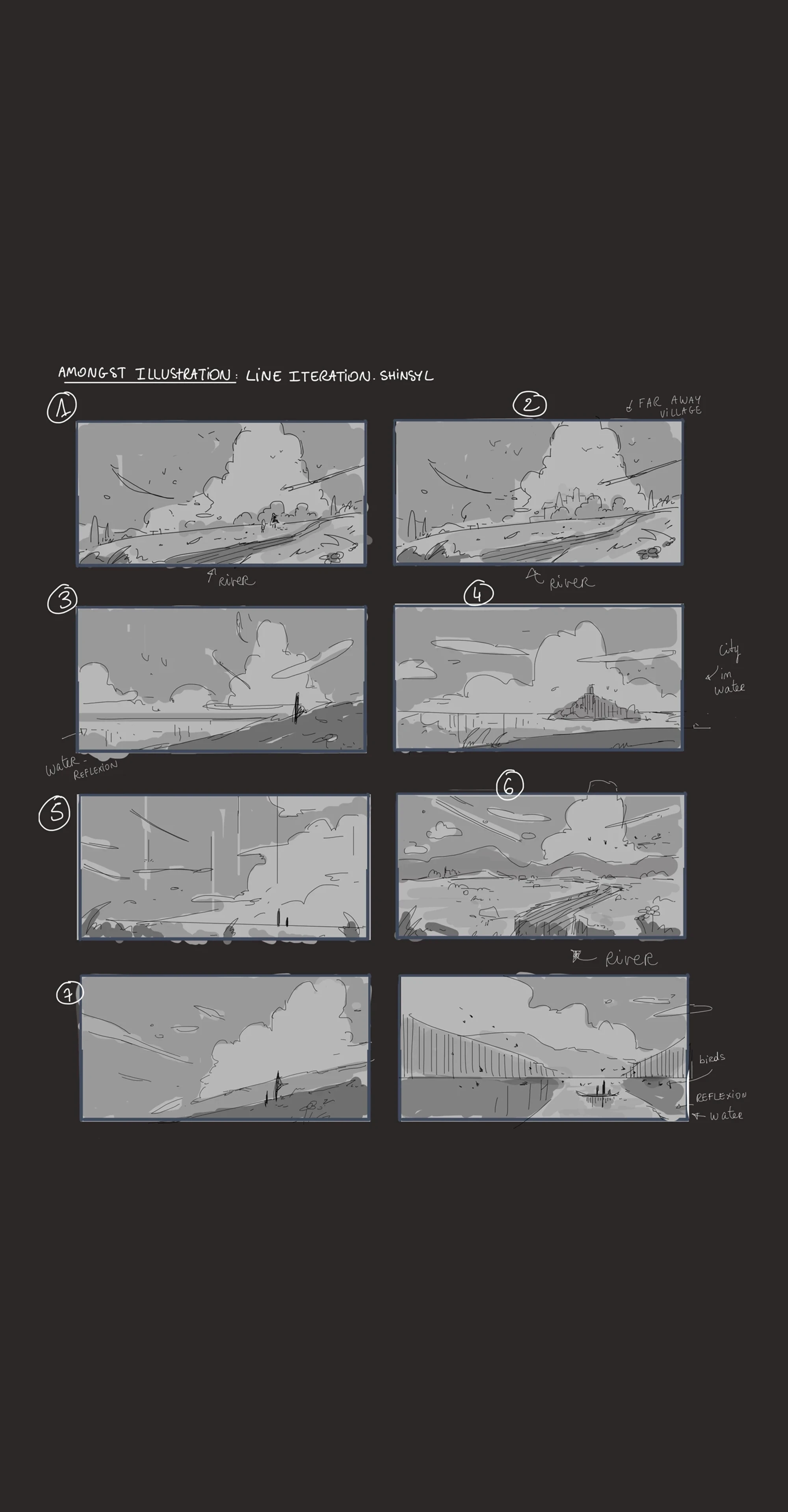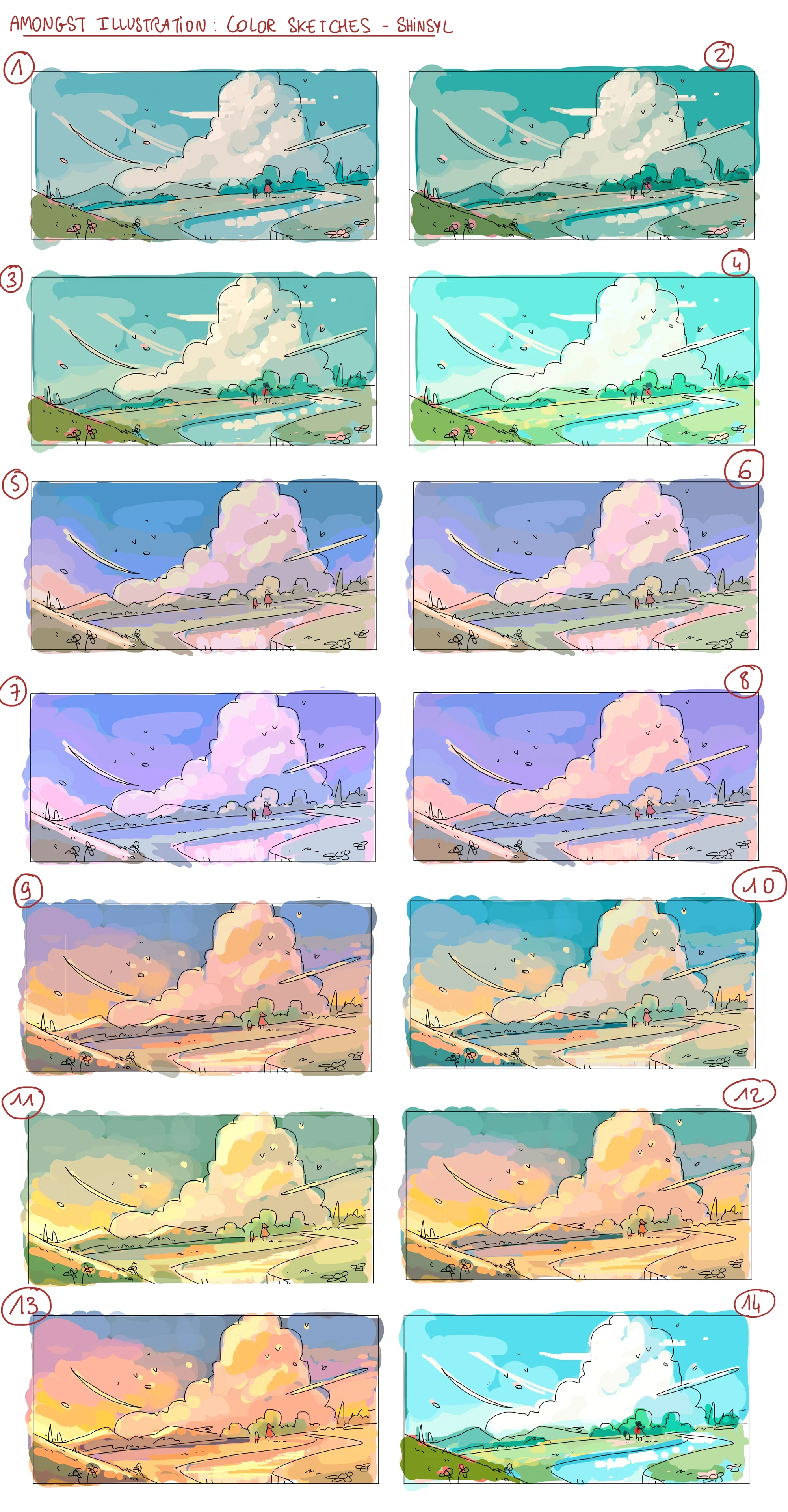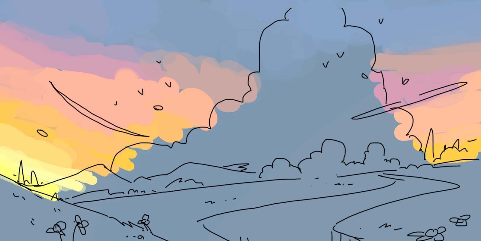 After determining which direction and color palette to go with, we began refining the details from colors to small details like the rocks, river, clouds, flowers, line streaks, and more.