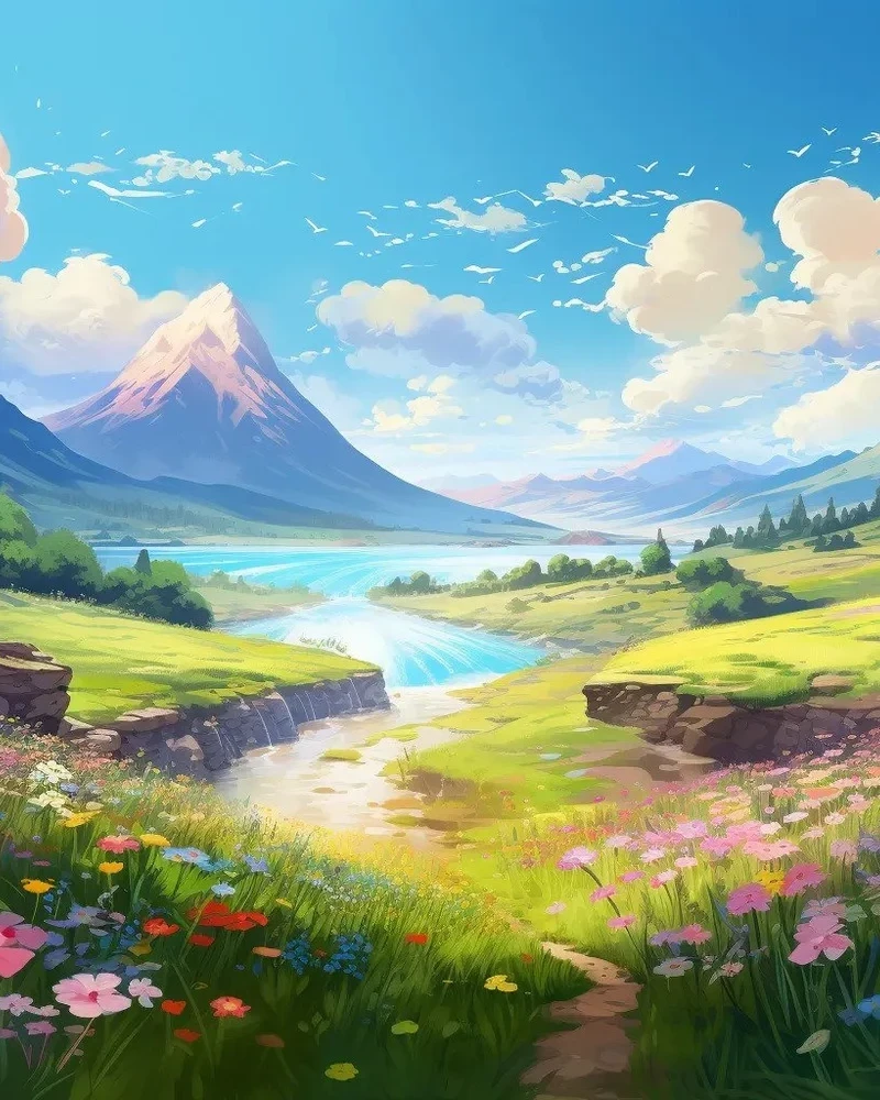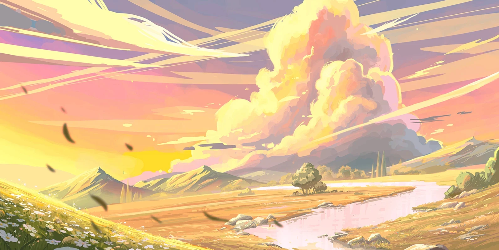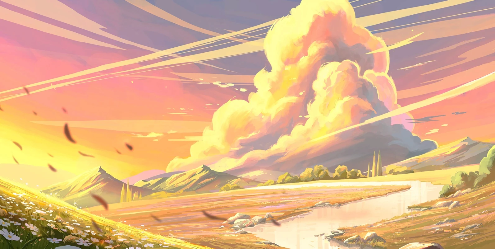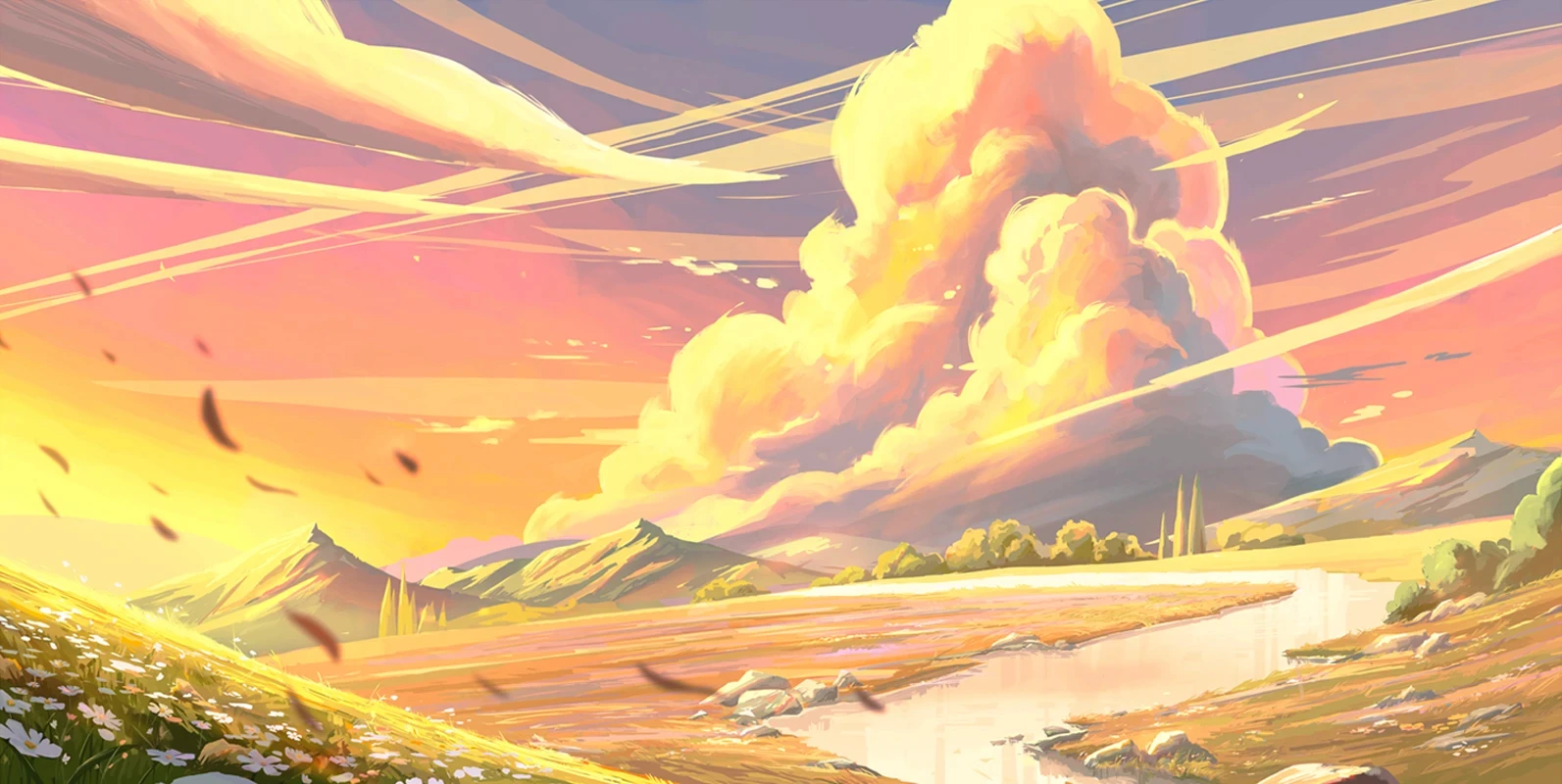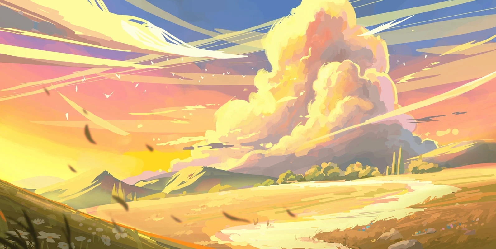 After determining which direction and color palette to go with, we began refining the details from colors to small details like the rocks, river, clouds, flowers, line streaks, and more.