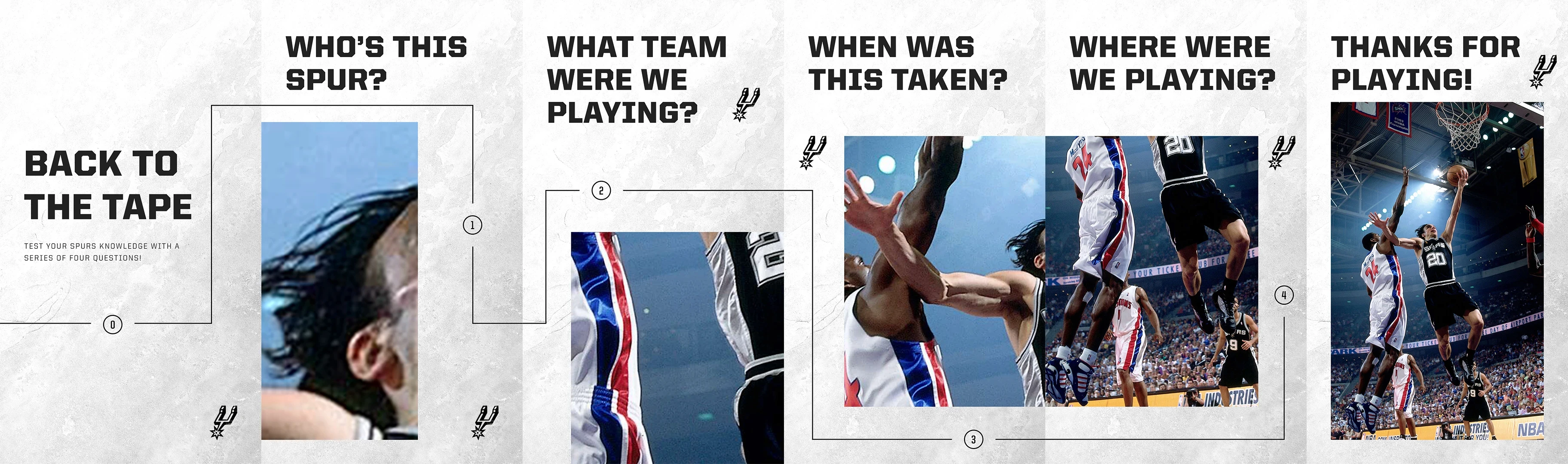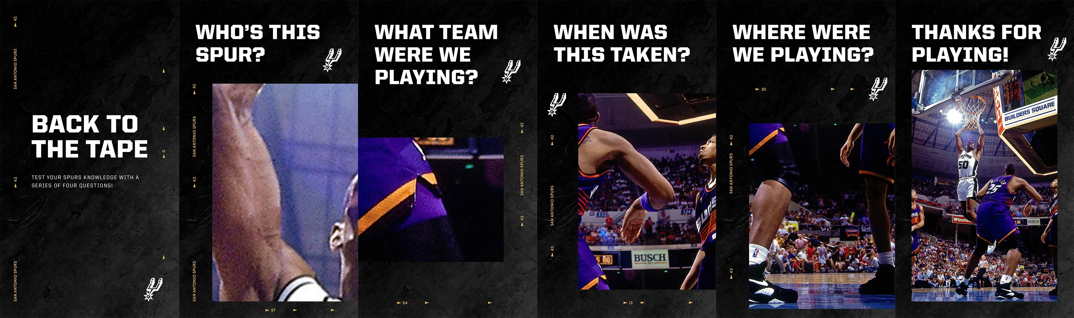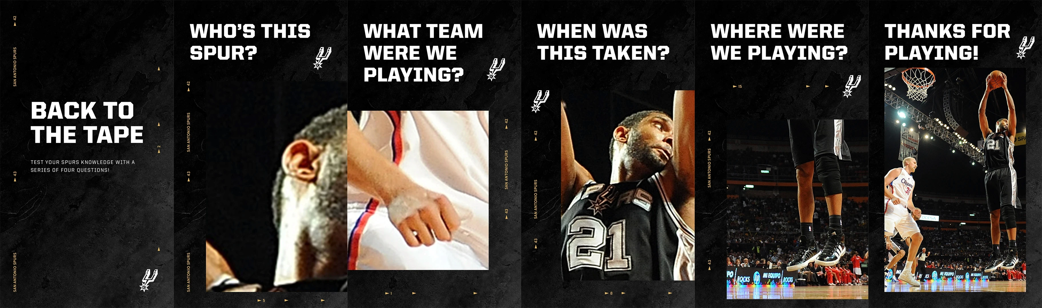 Carousel posts developed for Instagram stories and Twitter that highlight an iconic moment in Spurs history and engage fans through a series of questions.