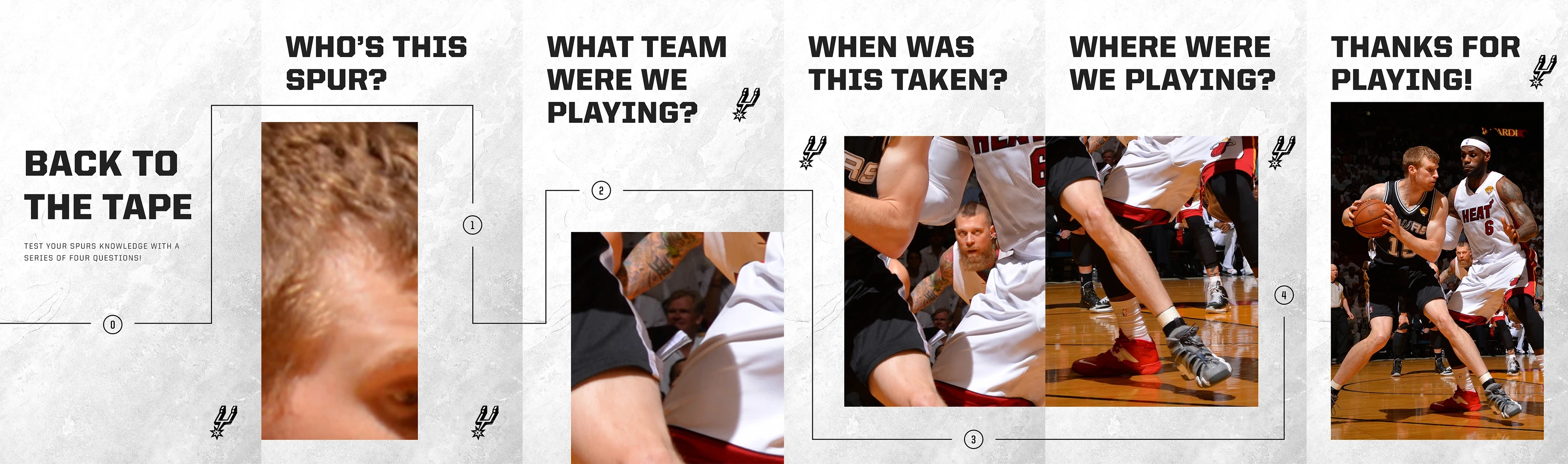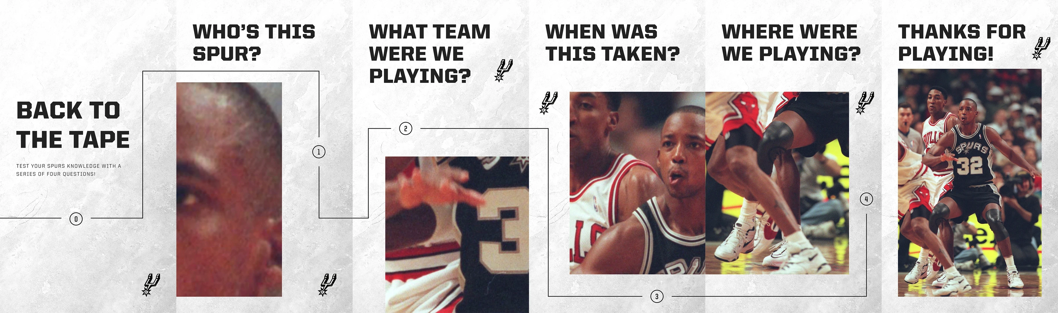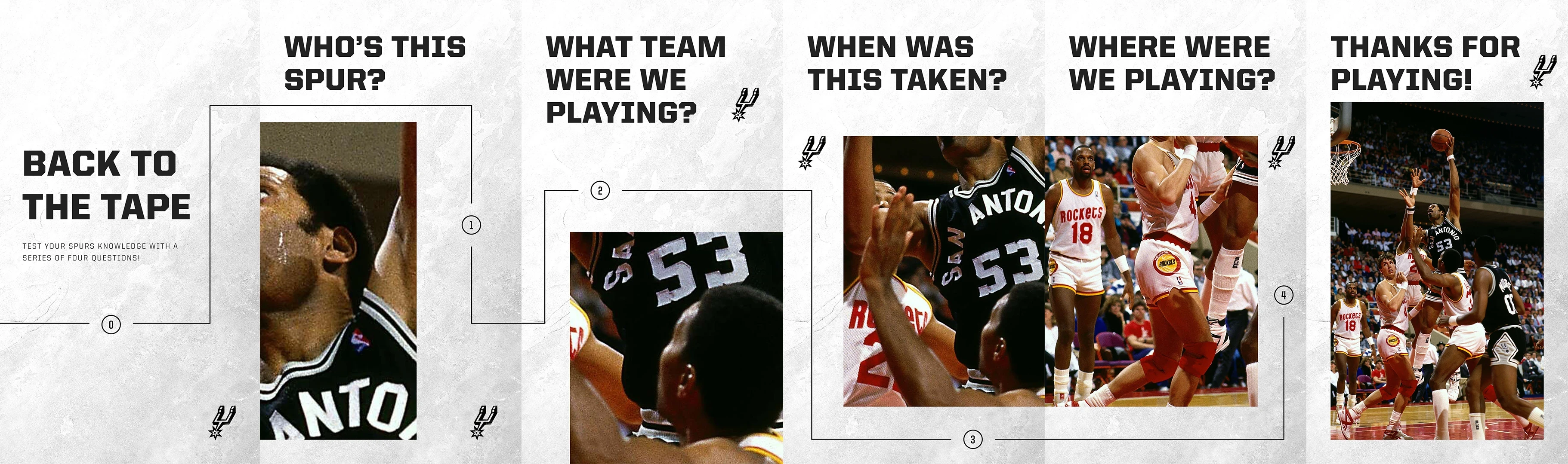 Carousel posts developed for Instagram stories and Twitter that highlight an iconic moment in Spurs history and engage fans through a series of questions.